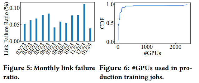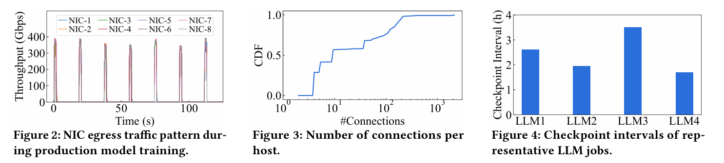 流量数量少:一般云计算实例通常产生数十万个连接;LLM训练中每个节点产生的连接少至及时到几百个(Figure 3),每个流需要发送的实际数据量巨大