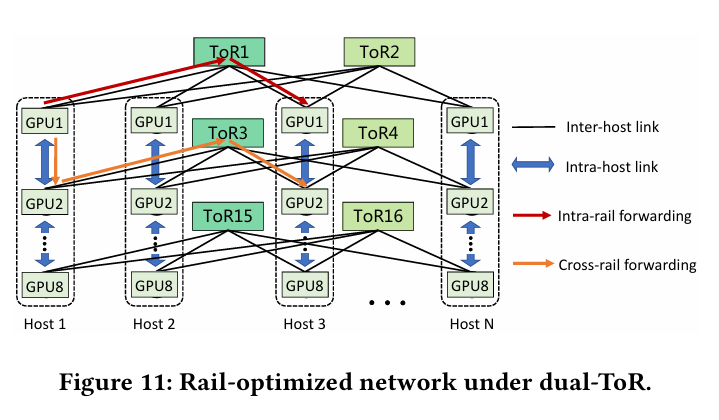 - 容错,链路冗余:每个GPU对应的NIC两个端口分别连接到不同的ToR交换机