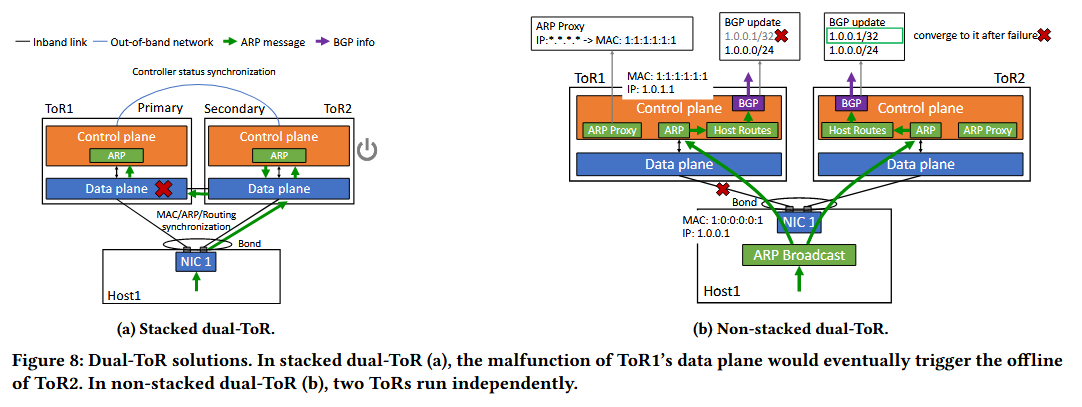 - 传统数据中心网络中的堆叠式双ToR:每个网卡两个端口通过一根连接到ToR交换机的电缆/光纤进行汇聚,易受交换机/链路故障影响,影响LLM训练