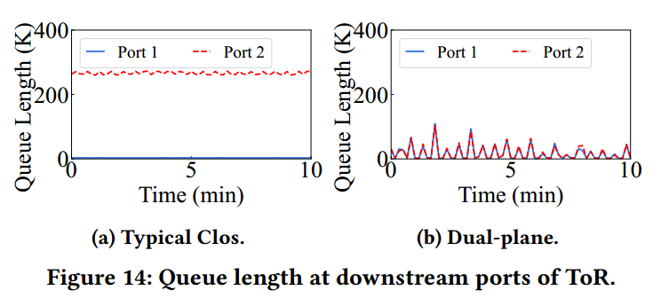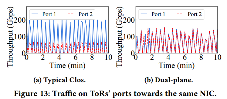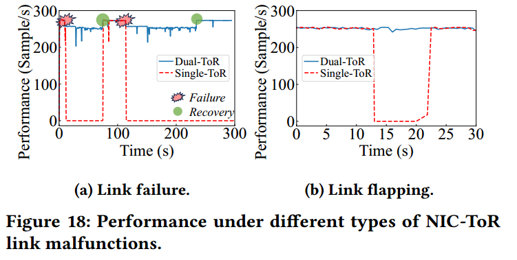 可靠性验证:该方案已部署使用超过8个月(2024.8.4前数据),未发生ToR导致的单点失效(Figure 18.a),在NIC-ToR链路故障时,双ToR涉及仅导致6.2%性能波动,而单ToR方案则会导致训练直接中断(Figure 18.b),同时非堆叠双ToR设计有效缓解了链路拥塞(Figure 13、14)