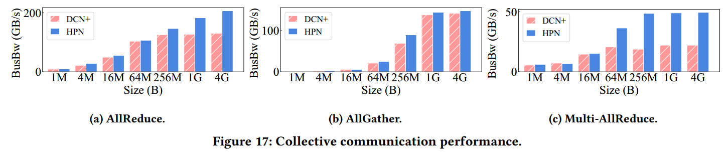 通信算子加速:AllReduce 性能提升高达59.3%(Figure 17.a),Multi-AllReduce 性能提升达158.2%(Figure 17.c),这主要归功于更好的负载均衡和跨段流量的减少