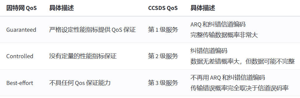 - 强大的数据链路层与物理层。因为大多数航天器以地面站对单个航天器的形式进行通信,网络层和传输层在该情况下作用不大。