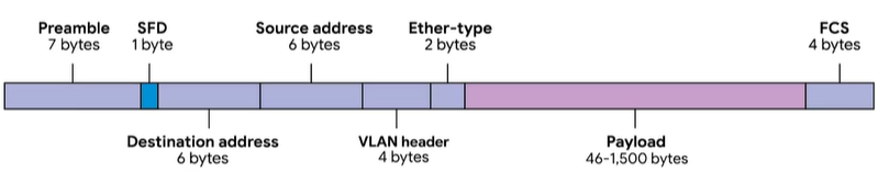 - VLAN header+Ether-type:6 bytes, 区分不同的 VLAN,并描述帧内容