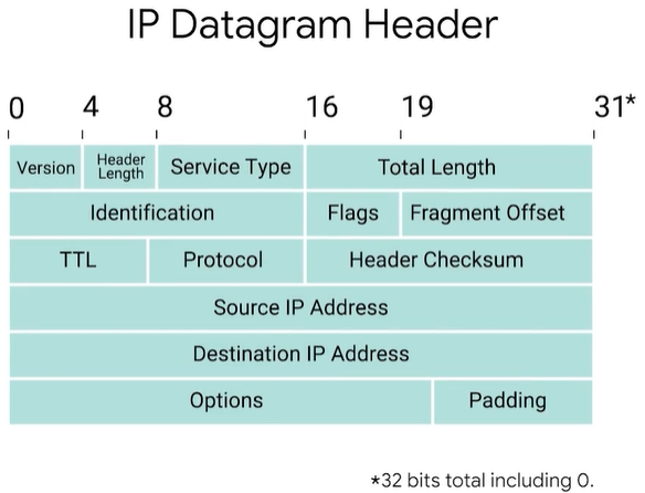 - 头部校验和(Header Checksum):16 bits,检查 IP 数据报头的内容,由于 TTL 变化,该字段也会变化,用于检测数据报是否被修改或丢弃